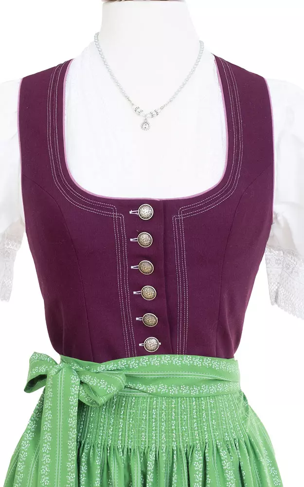 Bitte beachten Sie, dass Dirndlkleider auf Figur gearbeitet sind und eng sitzen müssen. Gegenüber modischer Kleidung fallen sie daher eher klein aus. Bitte beachten Sie deshalb unsere Maßtabelle. Die Seitennähte unserer Modelle sind so versäubert, dass Sie leicht um bis zu eine Konfektionsgröße enger oder weiter gemacht werden können.