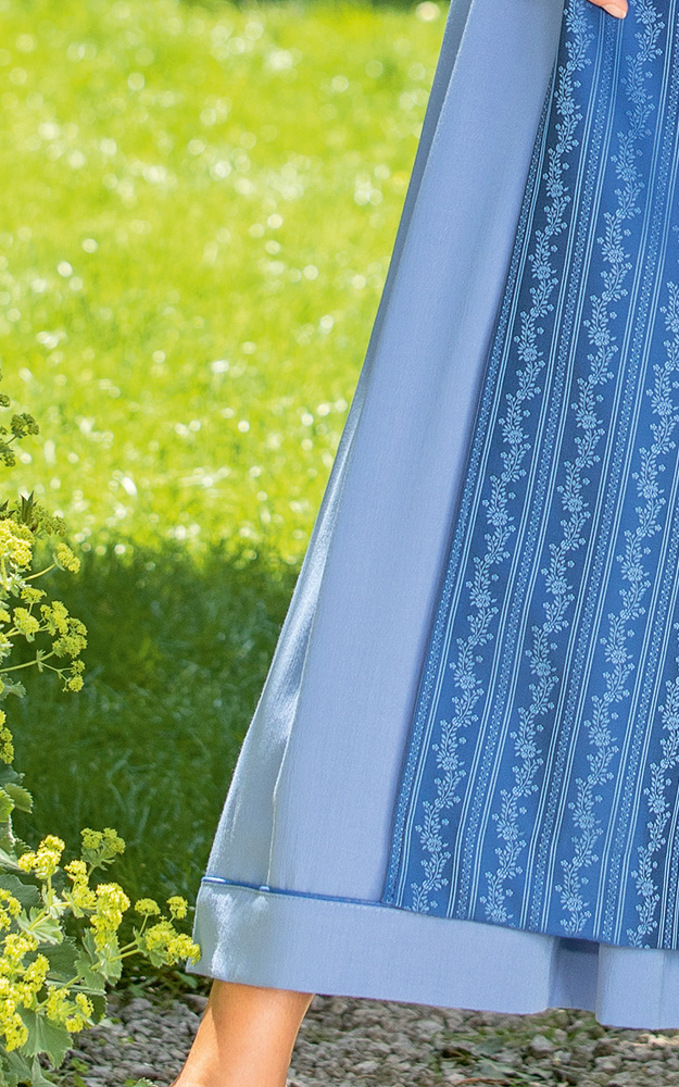 Festliches Dirndl mit Satin-Faltenrüsche am Oberteil aus seidig glänzendem Jacquard und faltengelegtem Rock (Länge 90 cm) mit Saumpaspelierung. Separat erhältlich: Die Schürze in passendem Streifen-Dessin ist mit Satin-Schürzenbändern ausgestattet. Bluse mit blauer Kanteneinfassung an Ausschnitt und Ärmeln.