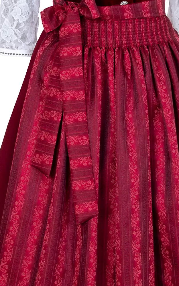 Elegantes Miederdirndl mit betont schlichtem Oberteil aus edlem Samt und faltengelegtem Rock in Trachtenlänge 80 cm. Die schimmernde Jacquard-Schürze ist farbharmonisch dazu abgestimmt. Separat erhältlich: Hochgeschlossene Bluse aus romantischer Elastikspitze mit 3/4-Arm.