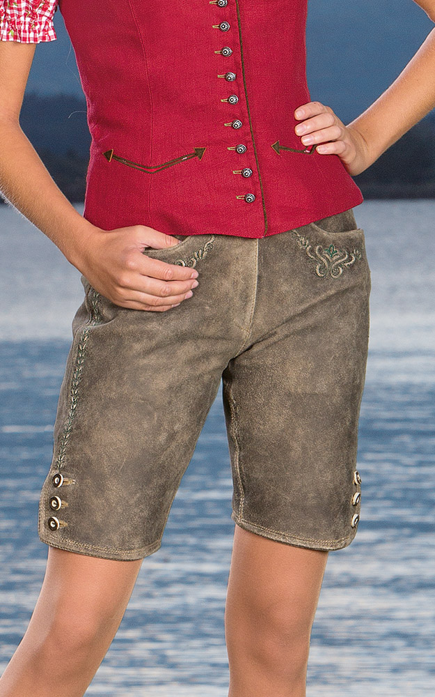 Fesche Lederhose aus geschmeidigem Ziegen-Veloursleder in Antik-Optik mit dezenter Stickerei und Knöpfen an den Beinen. Weitere abgebildete Artikel sind nicht im Preis enthalten.