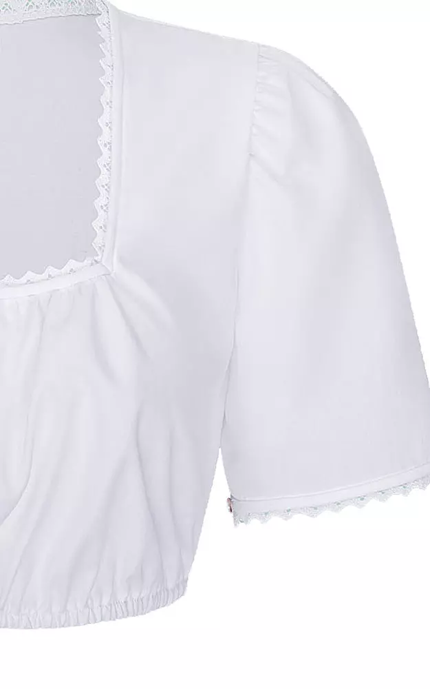 Eckiger Halsausschnitt, hinten rund. Die Keulenärmel sind mit kleiner Spitze verziert.