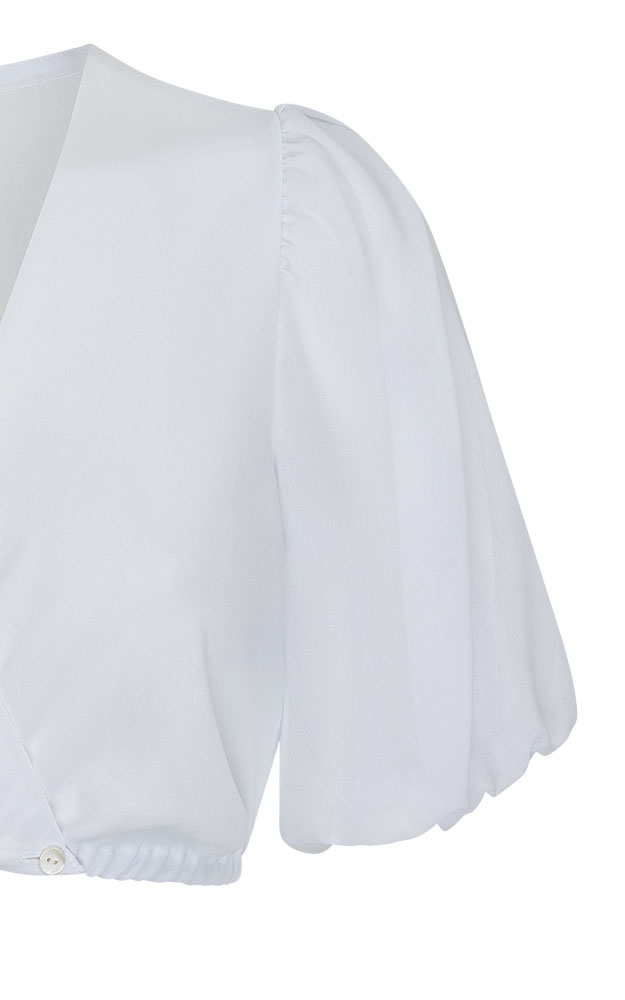 Wickelbluse aus Chiffon mit verstellbaren Knopfverschluss, langer Arm mit kleiner Rüsche am Ärmelsaum.