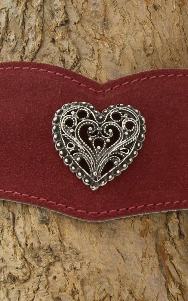 Eleganter, geschwungener Velours-Leder-Gürtel mit altsilberfarbenem Ornament.