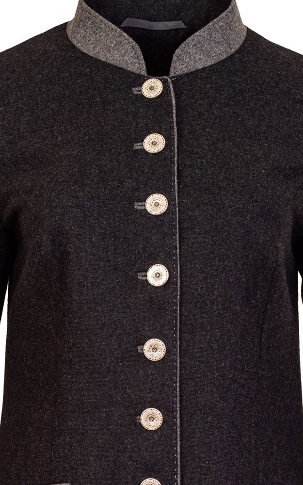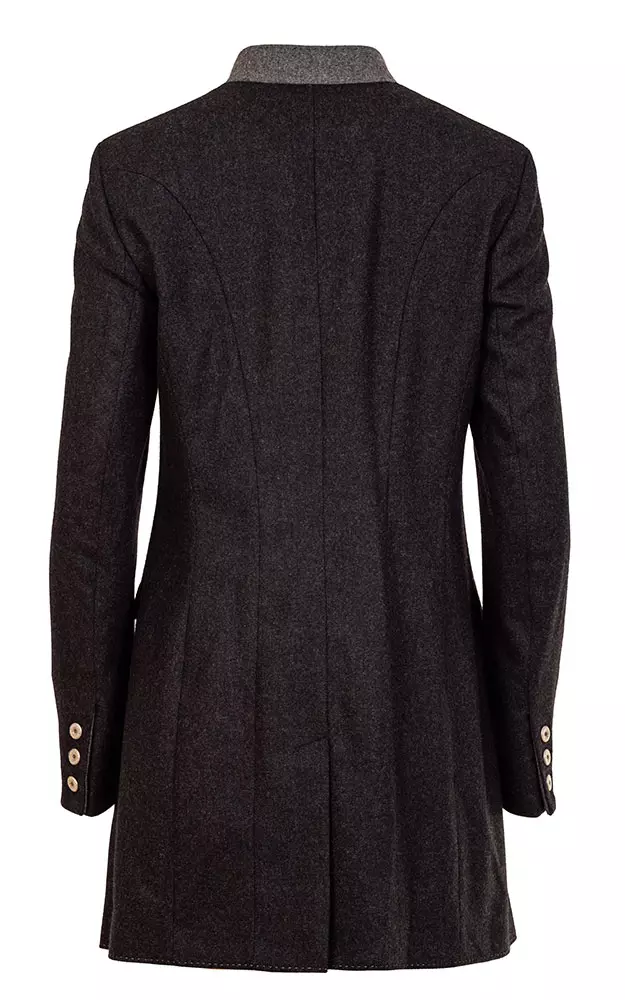 Eleganter Gehrock mit grauem Stehkragen. Das Innenfutter ist ebenfalls in zart schimmernden Grau gehalten.