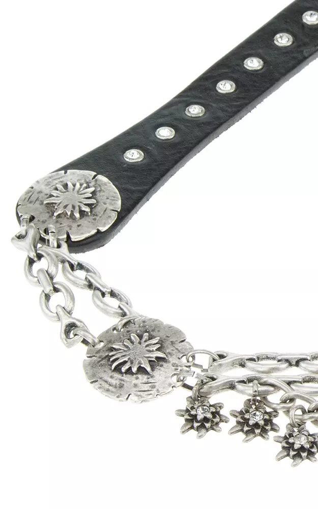 Extravaganter Damengürtel mit Kettencharivari und Lederriemen.