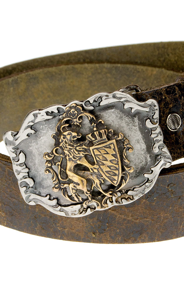 Mittelbraun-melierter Herrengürtel im Used-Look mit zweifarbiger Schnalle. Die erhabene Verzierung zeigt die Bayernraute samt Löwen. Die Gürtelgröße entspricht Ihrer Bundweite in Zentimeter. Da die Gürtellänge vom mittleren Loch bis zur Gürtelschnalle gemessen wird, haben Sie in beide Richtungen mindestens 2 Löcher um Ihren Gürtel enger oder weiter zu schnallen.