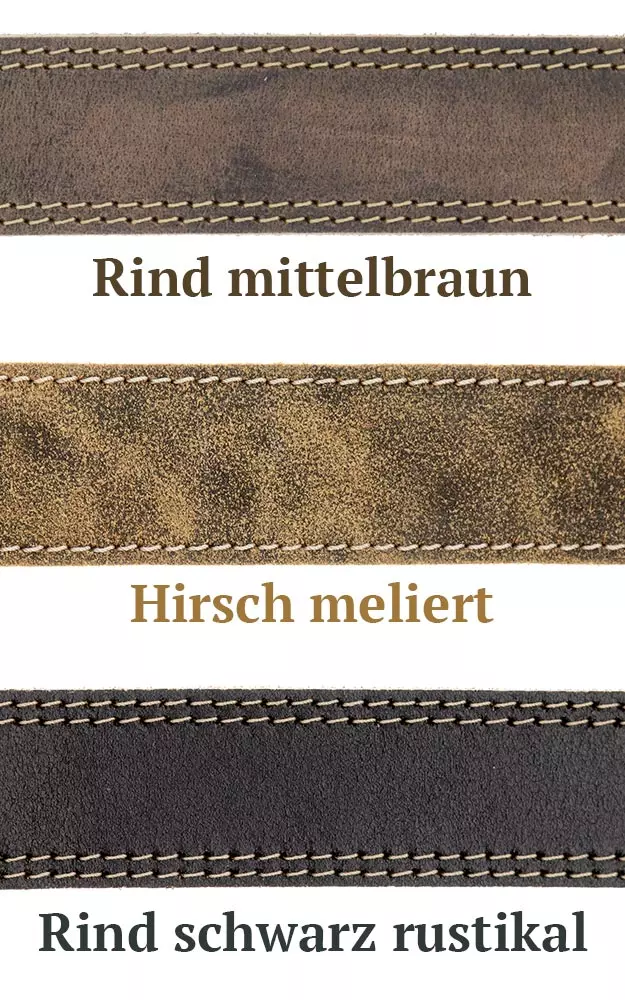 Wählen Sie zwischen drei verschiedenen Lederarten aus: Rindleder mittelbraun, Hirschleder meliert oder Rindleder schwarz. Die Gürtelbreite beträgt 4cm. Die Gürtelgröße entspricht Ihrer Bundweite in Zentimeter. Da die Gürtellänge vom mittleren Loch bis zur Gürtelschnalle gemessen wird, haben Sie in beide Richtungen mindestens 2 Löcher um Ihren Gürtel enger oder weiter zu schnallen.