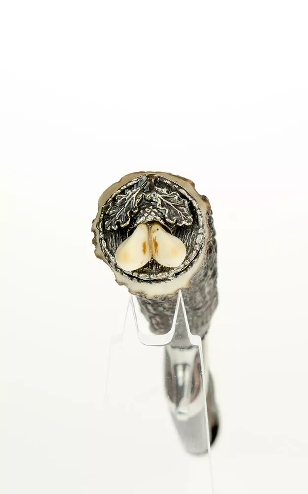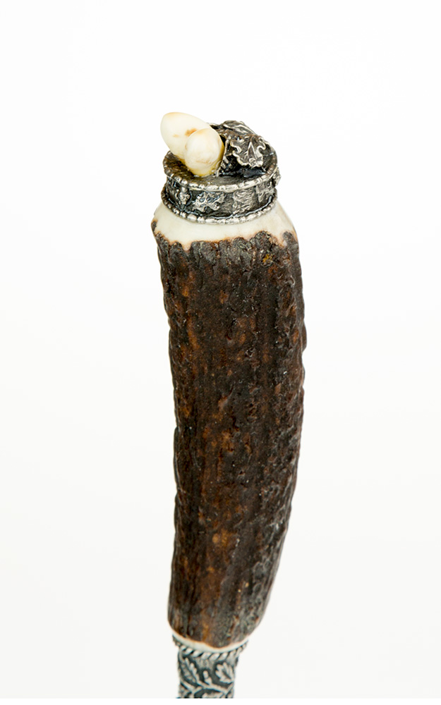 Der Übergang zwischen Klinge und Griff wird von einer versilberten Zwinge verziert. Am Ende des Griffs aus echtem Hirschhorn befindet sich ein kunstvoll versilbertes Grandel.