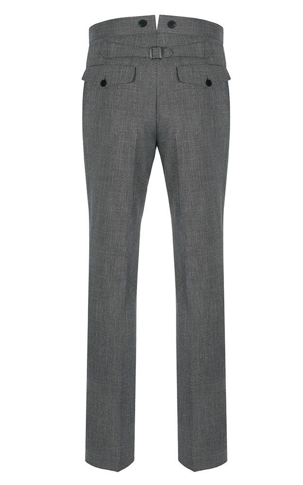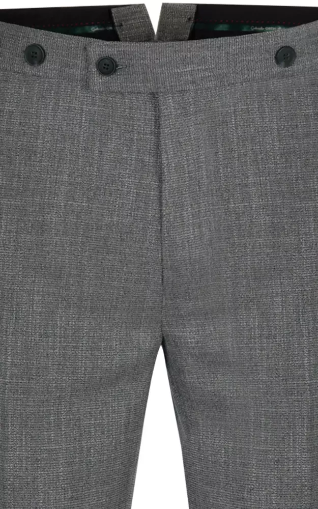 Leicht elastische Herrenhose mit Spitzbund ohne Gürtelschlaufen, Regular-Fit mit schmaler Silhouette, Knöpfen für Hosenträger und verstellbarem Riegel. Zwei schräge Eingrifftaschen, zwei Gesäßleistentaschen mit Patte, Vorderhosenabfütterung, Bundfutter, verlängertem Bund mit verdecktem Bundhaken und Knopf.