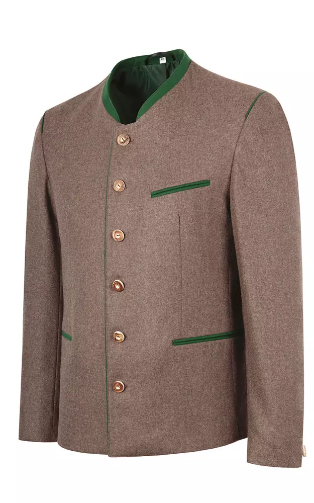 Einreihiger Janker mit Stehkragen in schlanker, kurz geschnittener Form mit drei Paspeltaschen, Paspel an Armkugel und Ärmel, Rückenfalte, geteilter Rückenspange mit Knopf, Hirschhorn-Knöpfen und drei Innentaschen.
