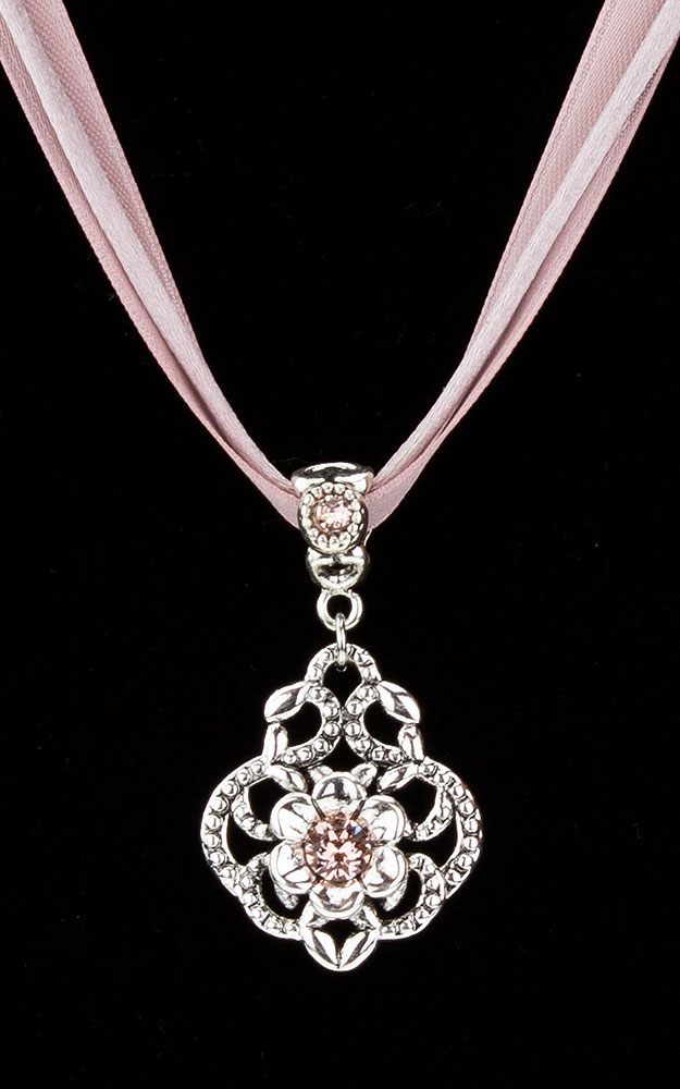 Trachten-Collier aus zwei glänzenden Satin-Schnüren mit einem antik-versilbertem Metall-Anhänger. Der Anhänger ist mit funkelnden Glas-Kristallen besetzt. Echt versilbert - 40 cm + 5 cm Verlängerung