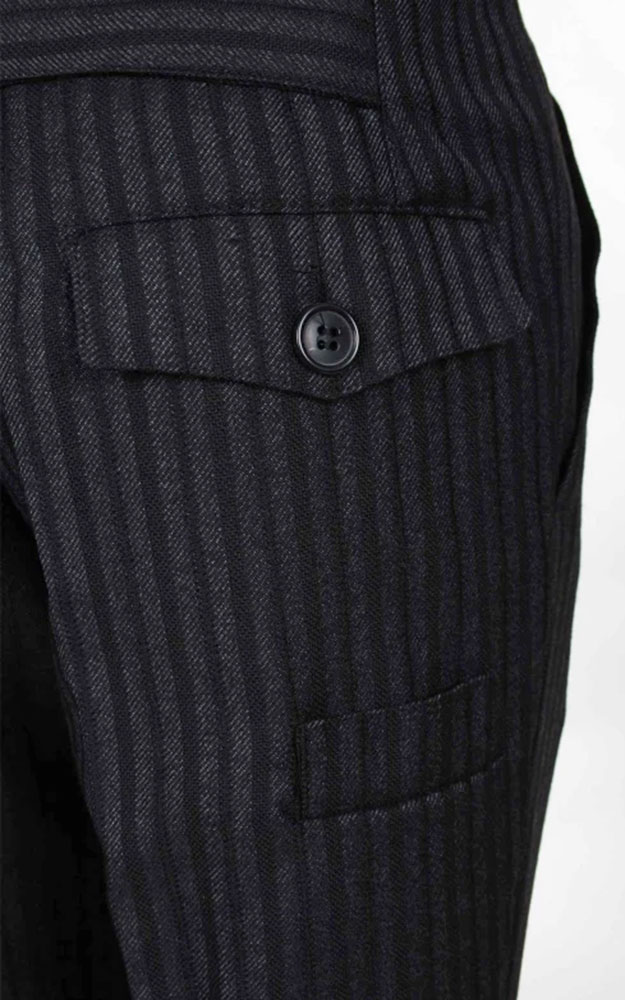Kinder-Stresemann-Hose aus reiner Schurwolle mit verstellbarem Riegel, zwei schrägen Eingrifftaschen, Gesäßleistentasche mit Patte und Knöpfen für Hosenträger. Zusätzlich ist rechts eine Messertasche, Vorder- und Hinterhosenabfütterung und ein Bundfutter eingearbeitet.