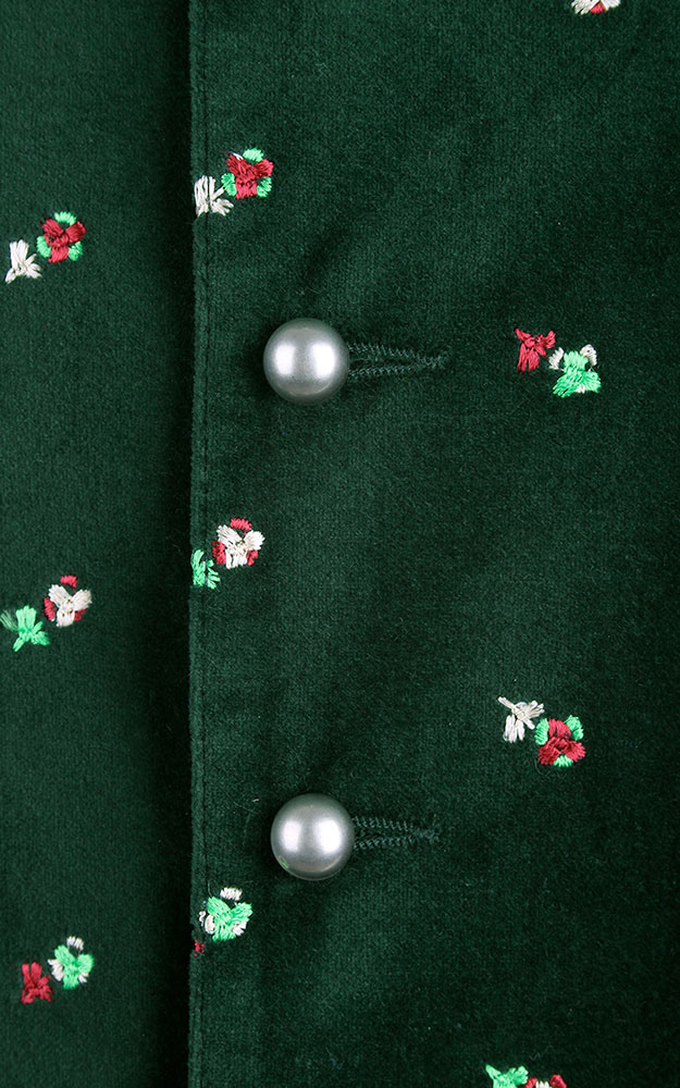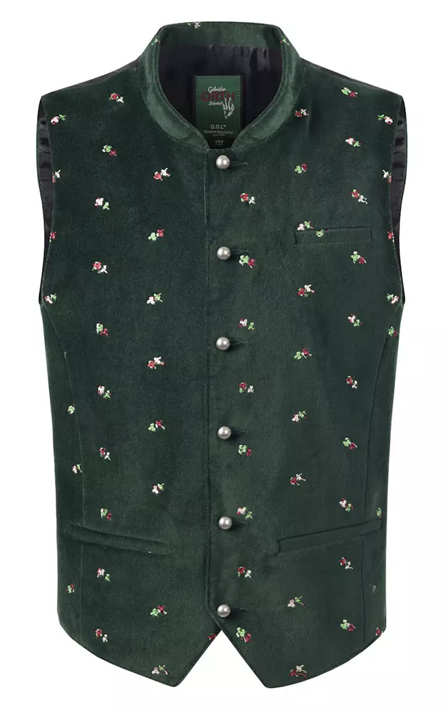 Samt-Trachtenweste, bestickt einreihig, Stehkragen, mit Metall-Kugelknöpfe, Stoffrücken mit Spange und drei Leistentaschen.