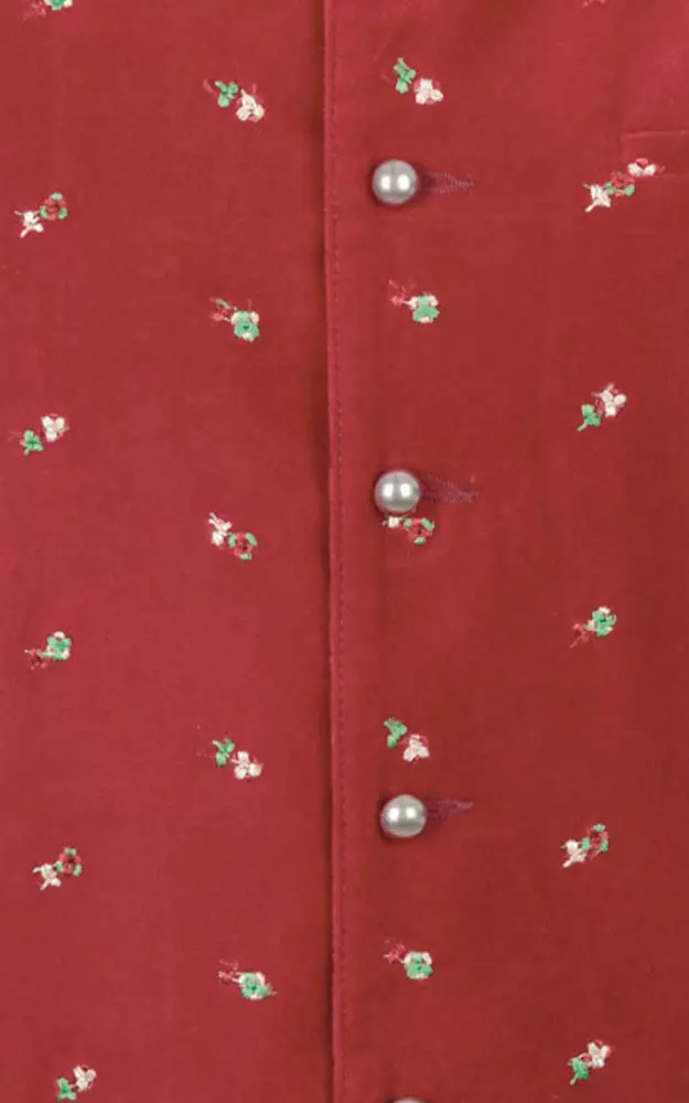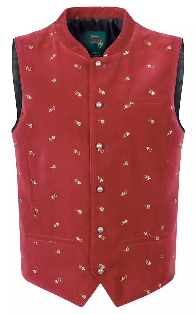 Samt-Trachtenweste, bestickt einreihig, Stehkragen, mit Metall-Kugelknöpfe, Stoffrücken mit Spange und drei Leistentaschen.