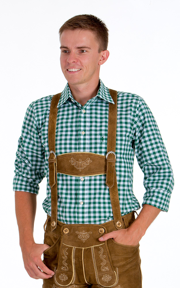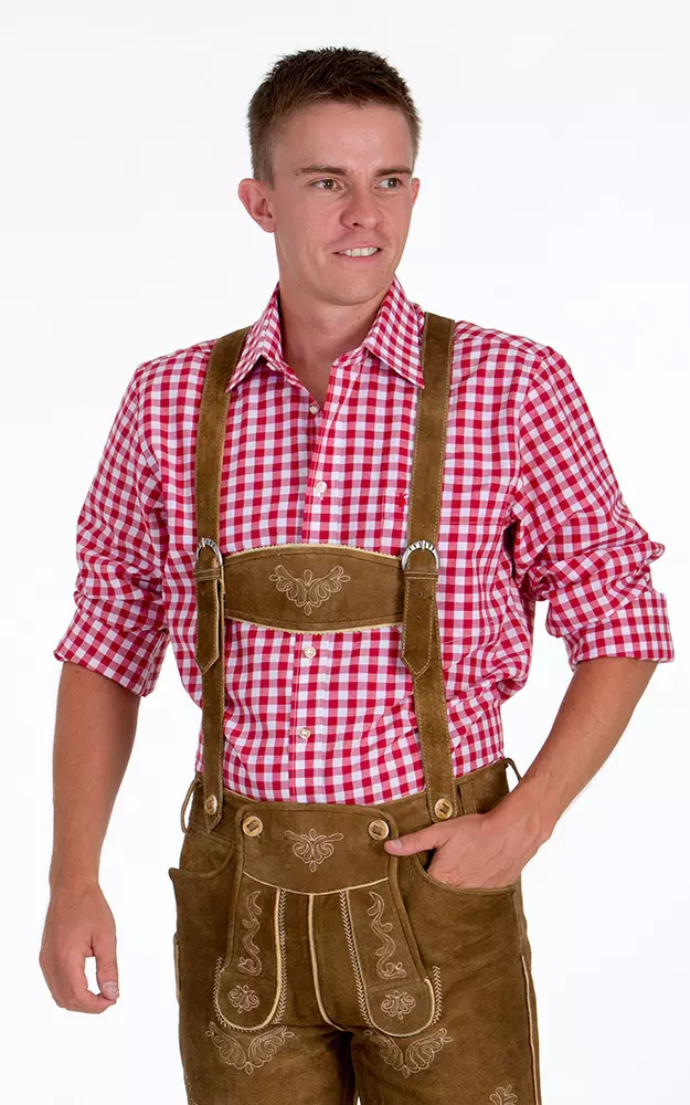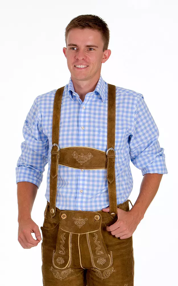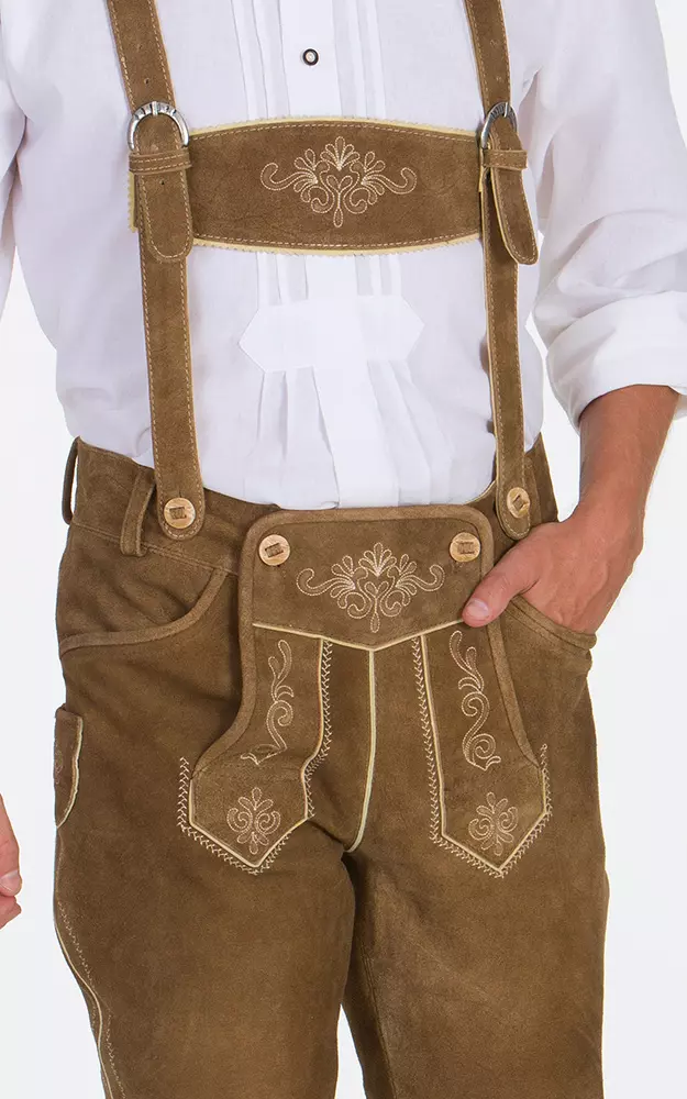 Hellbraune Bundhose mit Tellernaht, Messertasche und plastischen Stickereien aus echtem Wildbock-Veloursleder (kein Spaltleder) inkl. bestickten Trägern, entweder dem weißen Stehkragenhemd mit Riegel (100% Baumwolle), dem weißen Liegekragenhemd (100% Baumwolle), oder einem Karo-Hemd (60% Baumwolle, 40% Polyester) sowie Socken und Haferlschuhe.
