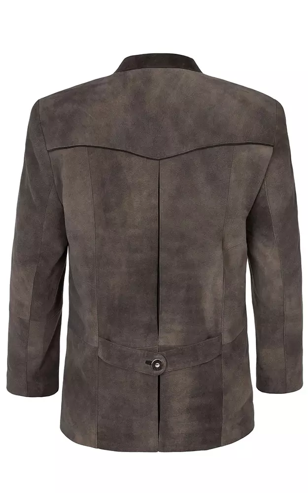 Trachten-Lederjacke mit leicht glänzendem, rotem Futtertaft. Im Inneren befinden sich drei Taschen, zwei mit Knopf- und eine mit Reissverschluß.