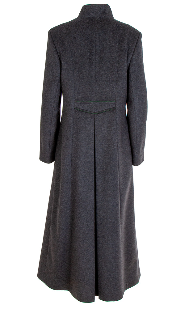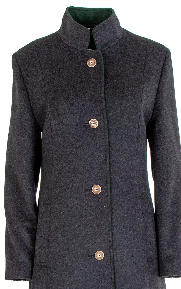 Eleganter Lodenmantel mit leichter Taillierung, tannengrünem Ausputz an den Kanten, Stehkragen sowie Hornknöpfen. Das Innenfutter ist in leicht schimmerndem, grünen Taft gehalten.