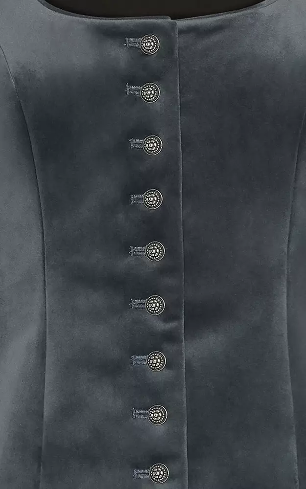 Klassisches, rund ausgeschnittenes Mieder aus super weichem Samt. Komplett gefüttert, Paspel im Ausschnitt, hochwertige Knöpfe.