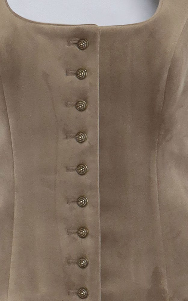 Klassisches, rund ausgeschnittenes Mieder aus super weichem Samt. Komplett gefüttert, Paspel im Ausschnitt, hochwertige Knöpfe.