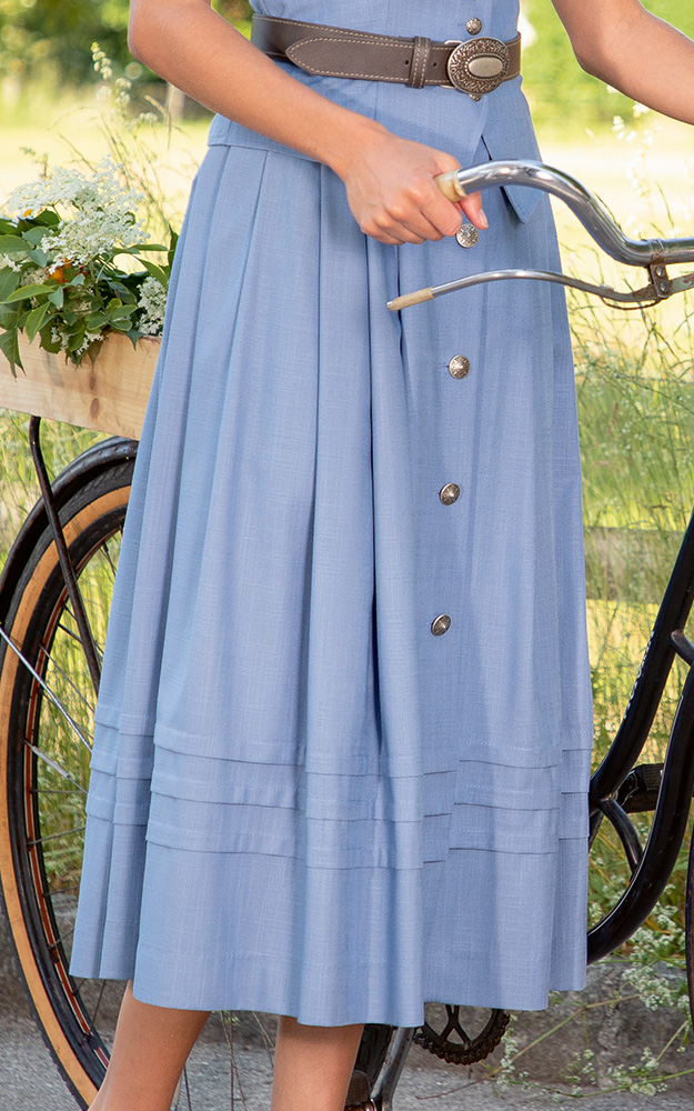 Faltengelegter, durchgeknöpfter Rock in Länge 80cm mit dekorativen Stufen.