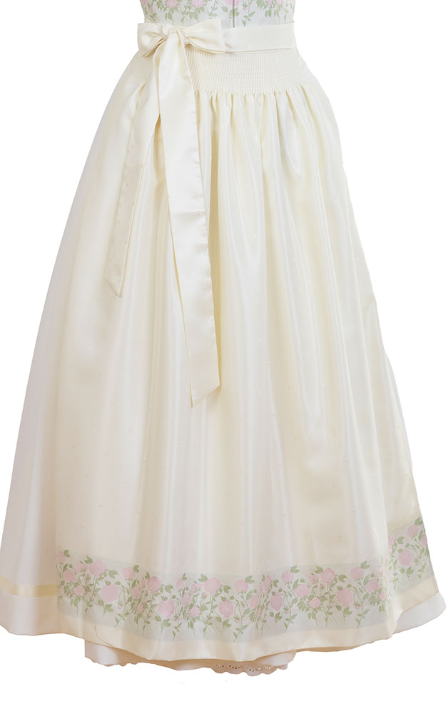 Exklusives Hochzeits- und Festdirndl mit Satin-Faltenrüsche am angeschnittenen Kelchkragen des Oberteils aus seidig schimmerndem Jacquard sowie faltengelegtem Rock in Trachtenlänge 90 cm. Separat erhältlich: Die passende Schürze mit bildschöner Rosenbordüre. Bitte beachten Sie, dass Dirndlkleider auf Figur gearbeitet sind und eng sitzen müssen. Gegenüber modischer Kleidung fallen sie daher eher klein aus. Bitte beachten Sie deshalb unsere Maßtabelle. Die Seitennähte unserer Modelle sind so versäubert, dass Sie leicht um bis zu eine Konfektionsgröße enger oder weiter gemacht werden können. Bei Fragen beraten wir Sie gerne telefonisch. Im Preis enthalten ist das Dirndl ohne Schürze, ohne Bluse oder weitere abgebildete Artikel.