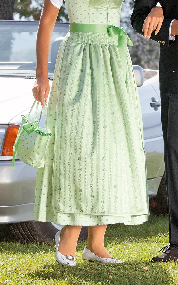 Exklusives Hochzeits- und Festdirndl aus märchenhaft schimmerndem Jacquard mit Satin-Faltenrüsche am angeschnittenem Kelchkragen und faltengelegtem Rock in Trachtenlänge 90 cm. Passend dazu: Die elegante Wende-Schürze in passendem Streifen-Dessin kann beidseitig getragen werden. Edel wirkt die Taftbluse mit gerafften Ärmeln und Stuart-Kragen. Bitte beachten Sie, dass Dirndlkleider auf Figur gearbeitet sind und eng sitzen müssen. Gegenüber modischer Kleidung fallen sie daher eher klein aus. Bitte beachten Sie deshalb unsere Maßtabelle. Die Seitennähte unserer Modelle sind so versäubert, dass Sie leicht um bis zu eine Konfektionsgröße enger oder weiter gemacht werden können. Bei Fragen beraten wir Sie gerne telefonisch. Im Preis enthalten ist das Dirndl ohne Schürze, ohne Bluse oder weitere abgebildete Artikel.