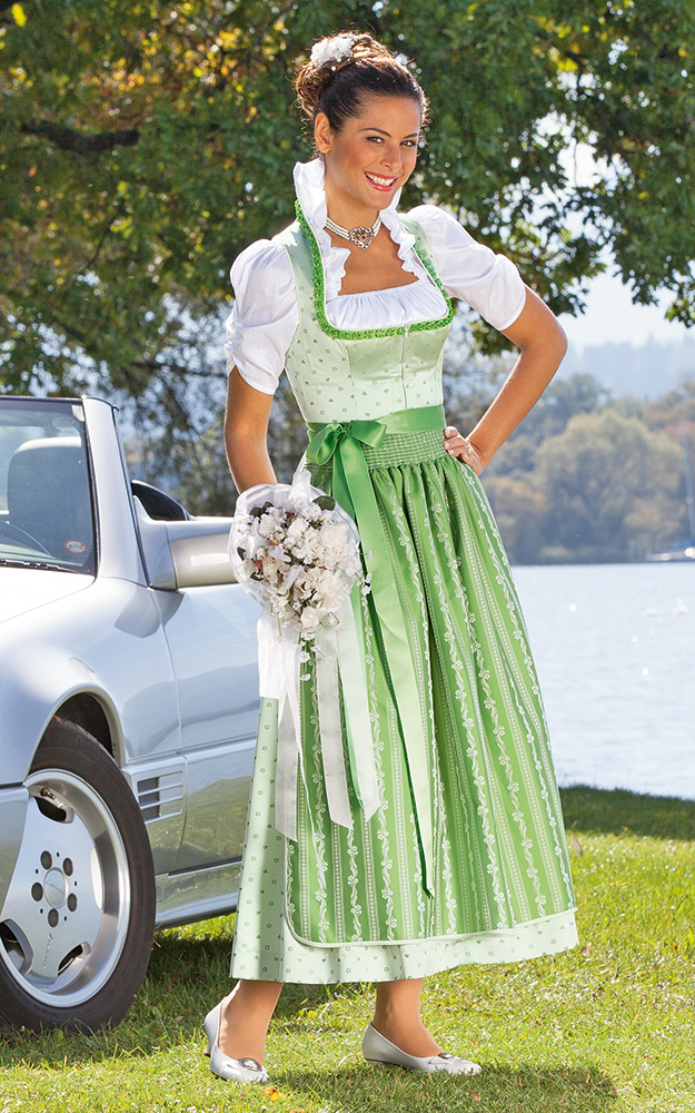 Exklusives Hochzeits- und Festdirndl aus märchenhaft schimmerndem Jacquard mit Satin-Faltenrüsche am angeschnittenem Kelchkragen und faltengelegtem Rock in Trachtenlänge 90 cm. Passend dazu: Die elegante Wende-Schürze in passendem Streifen-Dessin kann beidseitig getragen werden. Edel wirkt die Taftbluse mit gerafften Ärmeln und Stuart-Kragen. Bitte beachten Sie, dass Dirndlkleider auf Figur gearbeitet sind und eng sitzen müssen. Gegenüber modischer Kleidung fallen sie daher eher klein aus. Bitte beachten Sie deshalb unsere Maßtabelle. Die Seitennähte unserer Modelle sind so versäubert, dass Sie leicht um bis zu eine Konfektionsgröße enger oder weiter gemacht werden können. Bei Fragen beraten wir Sie gerne telefonisch. Im Preis enthalten ist das Dirndl ohne Schürze, ohne Bluse oder weitere abgebildete Artikel.