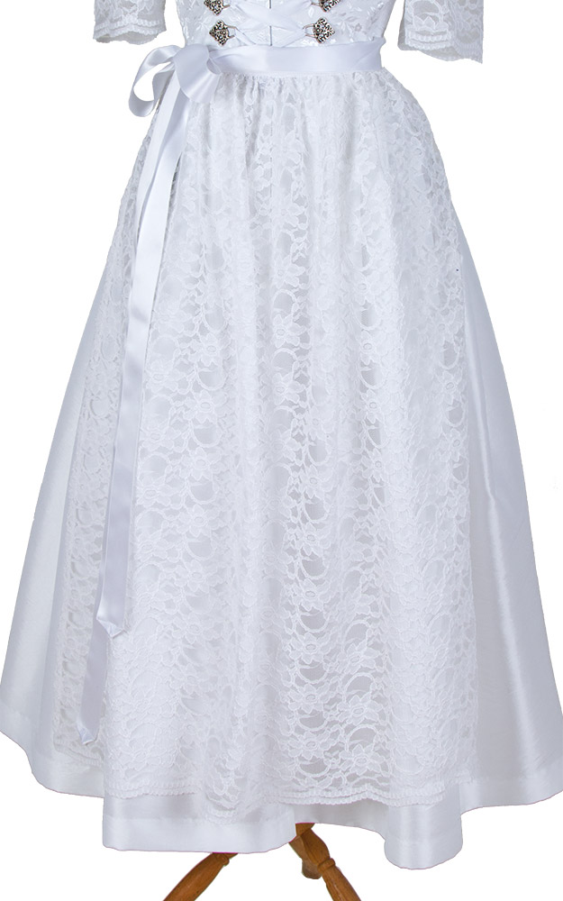 Bezaubernde Spitzenschürze mit Schürzenbändern aus weißem Satin. Perfekt zu Ihrem weißen Hochzeitsdirndl.