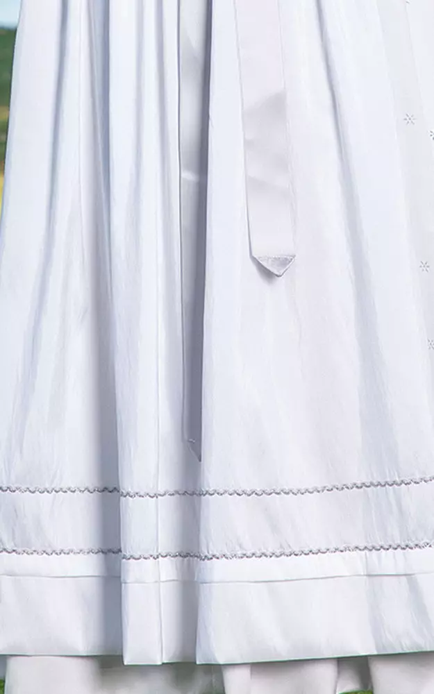 Elegantes Hochzeits- und Festdirndl aus märchenhaft schillerndem Jacquard mit extravagantem Bordürenmuster sowohl am Oberteil, als auch am faltengelegten Rock in Trachtenlänge 90 cm. Separat erhältlich: Die zart glänzende Taft-Schürze ist mit Satin-Schürzenbändern und Silberborten geschmückt, die eindrucksvolle Spitzenbluse mit Bogenkante am V-Ausschnitt und 3/4-Ärmeln spricht für sich.Bitte beachten Sie, dass Dirndlkleider auf Figur gearbeitet sind und eng sitzen müssen. Gegenüber modischer Kleidung fallen sie daher eher klein aus. Bitte beachten Sie deshalb unsere Maßtabelle. Die Seitennähte unserer Modelle sind so versäubert, dass Sie leicht um bis zu eine Konfektionsgröße enger oder weiter gemacht werden können. Bei Fragen beraten wir Sie gerne telefonisch. Im Preis enthalten ist das Dirndl ohne Schürze, ohne Bluse oder weitere abgebildete Artikel.