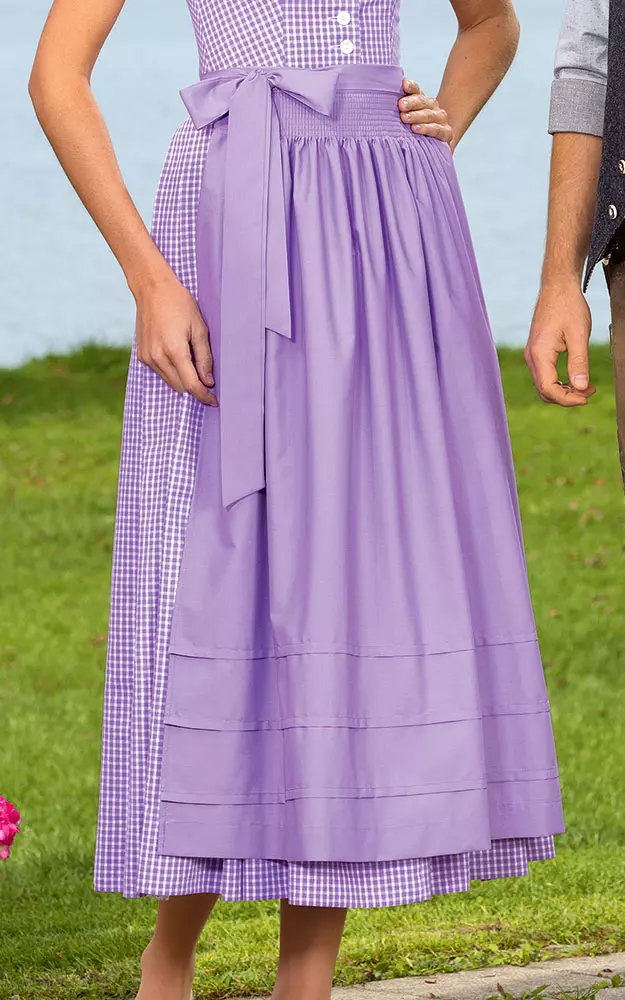 Stufengeschmückte Schürze in uni. Passend zu Rocklänge 90cm.