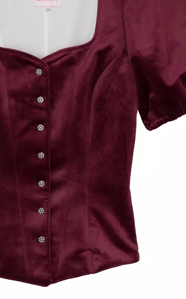 Klassisches, herzförmig ausgeschnittenes Mieder aus super weichem Samt. Komplett gefüttert, Paspel im Ausschnitt, hochwertige Knöpfe, elastische Bündchen und kleinem Schößchen am Rücken.